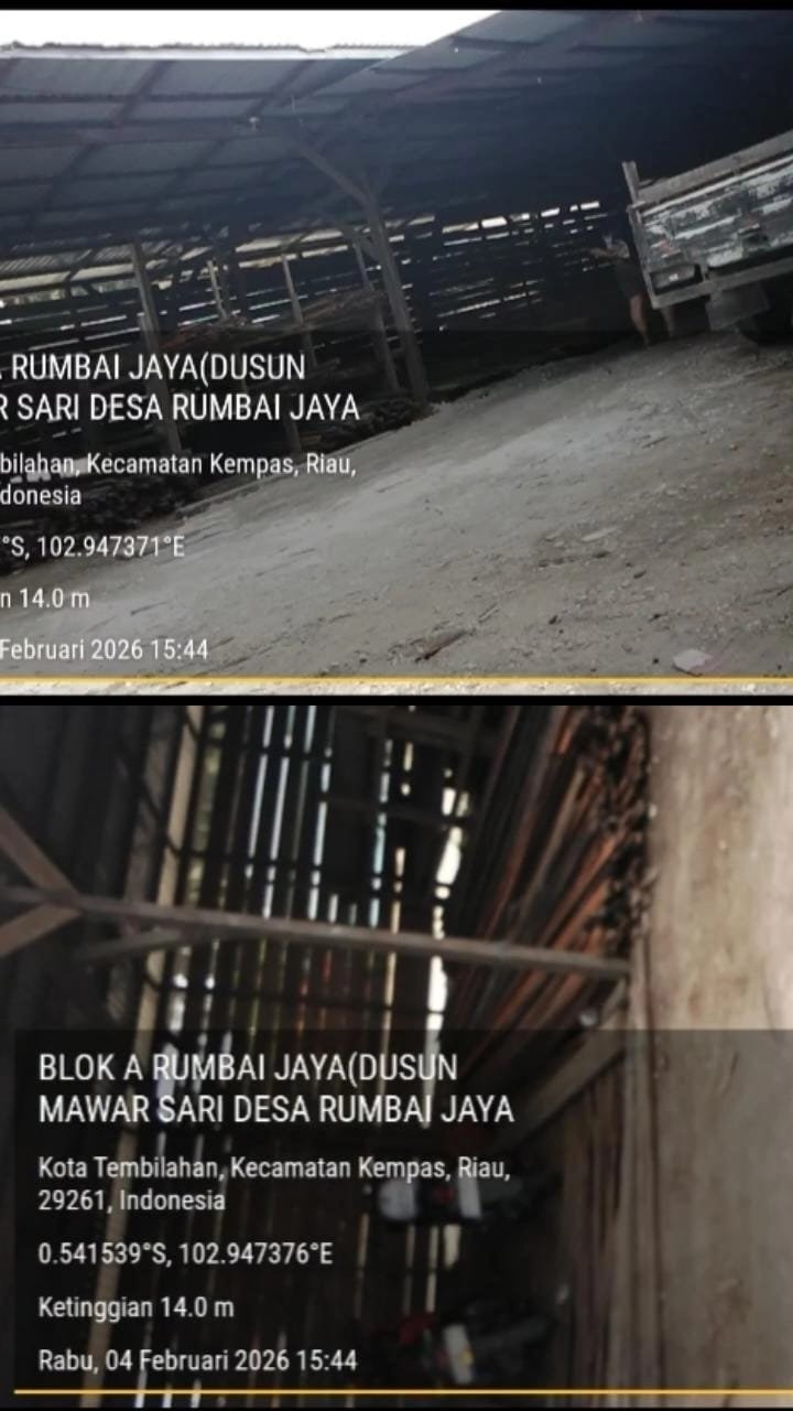 Dugaan ini diperkuat dengan dokumentasi foto berdata GPS yang menunjukkan lokasi jelas berada di titik koordinat 0.541539° S, 102.947376° E, dengan waktu pengambilan Rabu, 04 Februari 2026 pukul 15.44 WIB. Dari foto terlihat bangunan semi permanen beratap seng dengan tumpukan kayu serta akses keluar-masuk kendaraan, yang kuat diduga digunakan untuk penampungan dan pengolahan kayu ilegal.