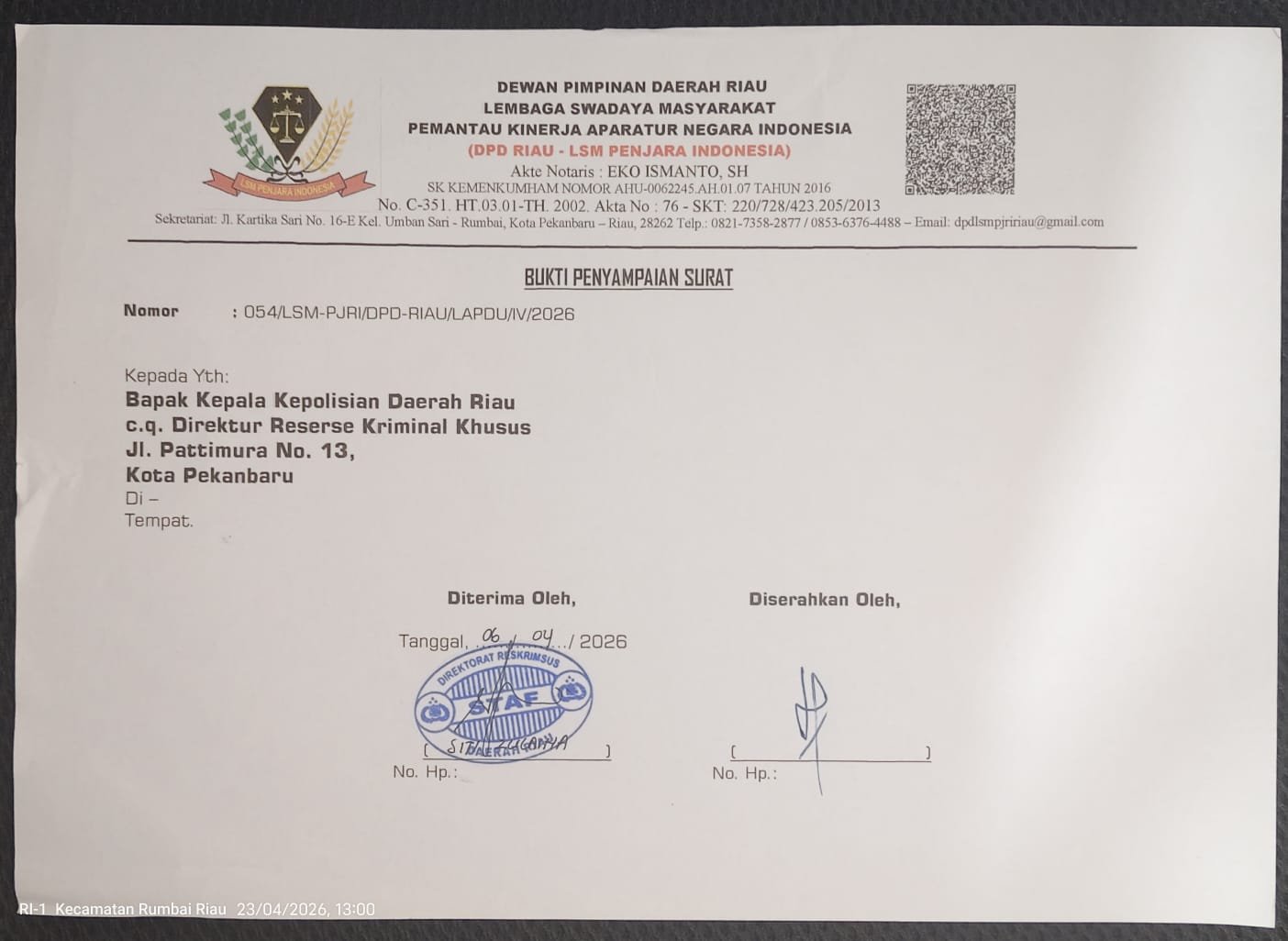 Dalam laporan resmi bernomor 054/LSM-PJRI/DPD-RIAU/LAPDU/IV/2026 tertanggal 6 April 2026, LSM Penjara Indonesia menyatakan telah menyerahkan sejumlah barang bukti, antara lain: