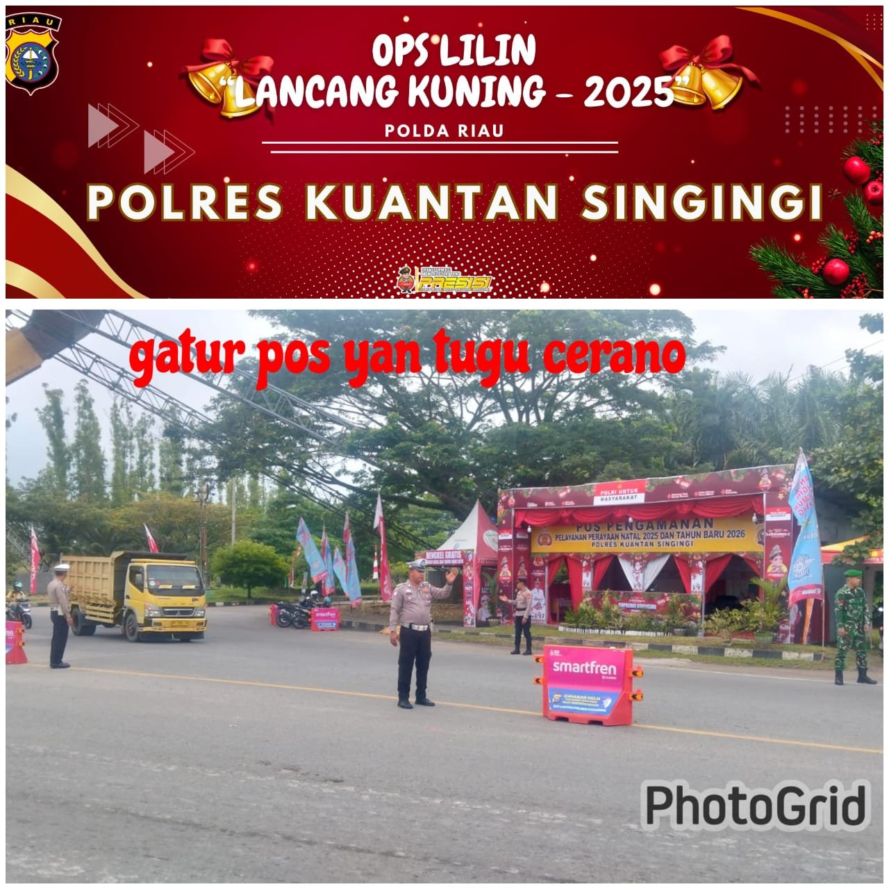 KUANTANSINGINGI,–Tuntasnusantara.com/ Dalam rangka mendukung kelancaran dan keamanan perayaan Natal 2025 serta Tahun Baru 2026, personel Pengamanan Pos Pelayanan (Pos Yan) Cerano melaksanakan pengecekan personel dan pengaturan arus lalu lintas di wilayah Kecamatan Kuantan Tengah, Kabupaten Kuantan Singingi, Senin (22/12/2025).