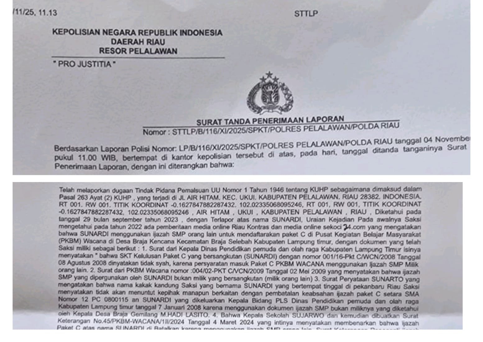 Polres Pelalawan memastikan akan menggelar perkara atas laporan yang telah resmi terdaftar sebagaimana tertuang dalam Surat Tanda Penerimaan Laporan (STTLP) Nomor: STTLP/B/116/XI/2025/SPKT/POLRES PELALAWAN/POLDA RIAU, tertanggal 04 November 2025. Dalam laporan tersebut oknum DPRD Kabupaten Pelalawan Inisial SD, diduga melakukan tindak pidana pemalsuan UU nomor 1 tahun 1946 tentang KUHP sebagaimana dimaksud dalam pasal 263 ayat (2) KUHP.