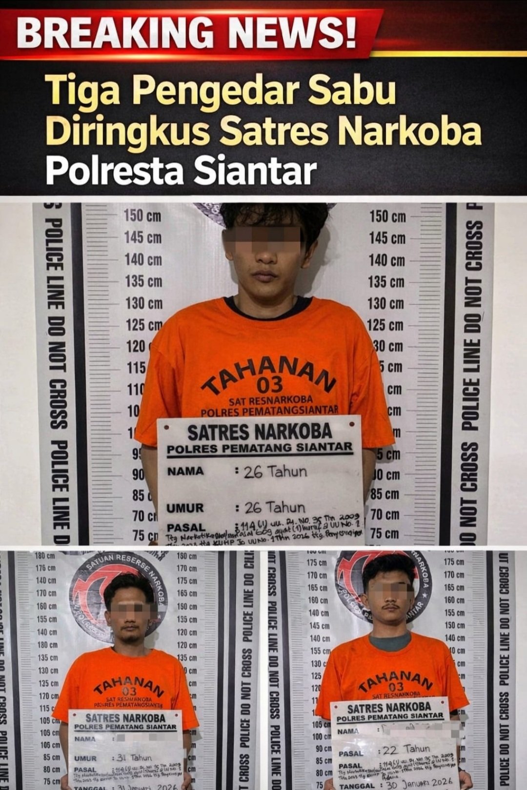 Informasi tersebut disampaikan Kapolres Pematangsiantar, AKBP Sah Udur T.M. Sitinjak, S.H., S.I.K., M.H., melalui Kasatres Narkoba, AKP Irwanta Sembiring. Ia menjelaskan, ketiga tersangka diamankan dalam rangkaian operasi penindakan yang dilakukan secara intensif.